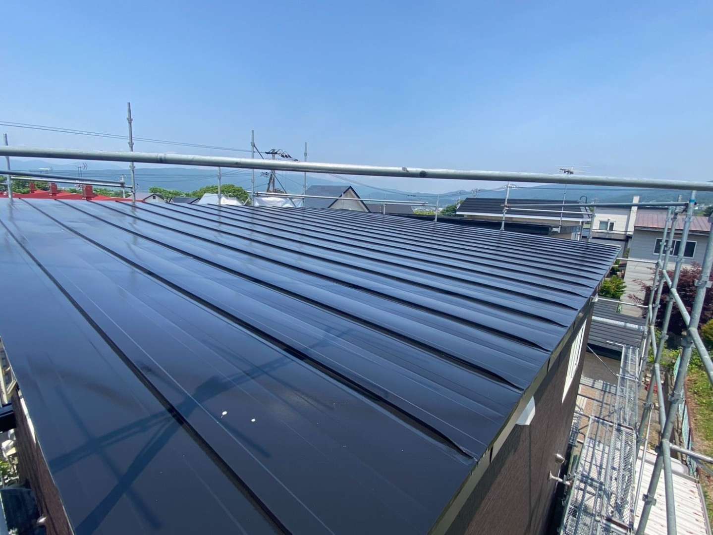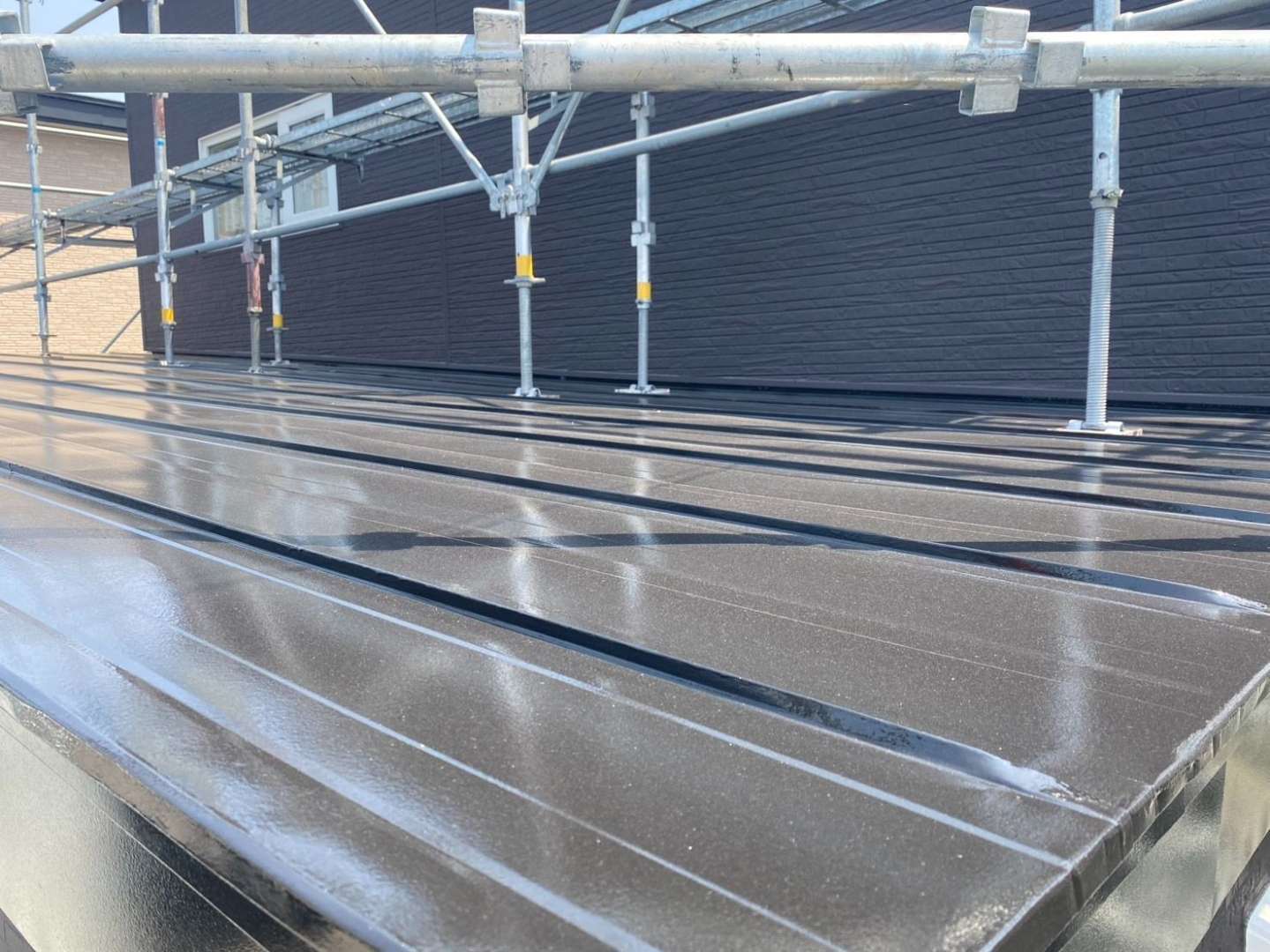 ダークブラウンのコルモロック(1CH1KD3K)を全面に採用。金属サイディングとは思えない立体的なテクスチャが、光の当たり方で豊かな表情を見せ、建物にどっしりとした風格を与えました。